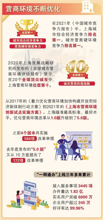 今年6月,《上海市2022年优化营商环境重点事项》公布,2022年年底前,上海将完成企业登记便捷、税费缴纳灵活、融资服务升级、信用监管提升、公用服务优化、项目审批提效、跨境贸易便利、科创培育赋能、纠纷化解高效、营商服务贴心这10个优化营商环境重点事项,提升市场主体感受度,激发市场主体信心和活力。