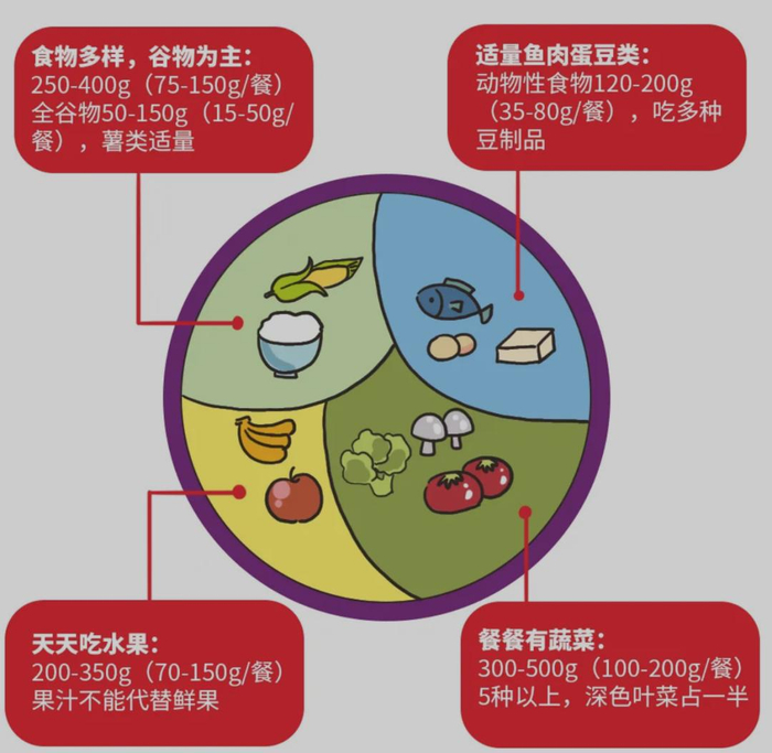 食物种类多样性、多吃蔬果、奶类、大豆、适量吃鱼、禽、蛋、瘦肉;