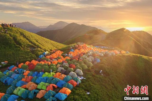 图为金色晨光洒向了江西武功山绿意盎然的万亩高山草甸以及山顶上的各色帐篷,不少游客正在欣赏日出美景。 刘芸池 摄 6月26日,航拍江西武功山观音宕景区附近的壮美日出,只见初升的太阳从东方冉冉升起,金色光芒洒向了武功山绿意盎然的万亩高山草甸以及山顶上的各色帐篷,不少游客正在欣赏日出美景。 此前一天,第十五届武功山国际帐篷季启动仪式在此成功举办,吸引了大量游客前来搭帐篷野营,深度感受武功山的夏日风光。
