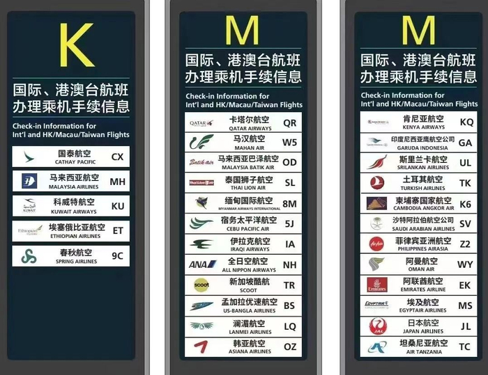 此次转到二号航站楼的国际航班值机柜台主要位于K、M值机区。K区主要办理国泰航空、马来西亚航空、科威特航空、埃塞俄比亚航空、春秋航空。M区主要办理卡塔尔航空、马汉航空、马来西亚巴泽航空、泰国狮子航空、缅甸国际航空、宿务太平洋航空、伊拉克航空、全日空航空、新加坡酷航、孟加拉优速航空、澜湄航空、韩亚航空、肯尼亚航空、印度尼西亚鹰航空公司、斯里兰卡航空、土耳其航空、柬埔寨国家航空、沙特阿拉伯航空公司、菲律宾亚洲航空、阿曼航空、阿联酋航空、埃及航空、日本航空、坦桑尼亚航空。旅客可根据航班提示前往相应柜台办理值机。