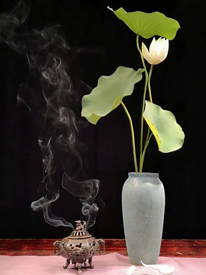 “荷花是6月的花神,每年阴历的6月,我的教室都会插荷花。荷花不仅中国文人喜欢,在日本也同样受到各个花道流派的钟爱。从最早的日本池坊花道流祖,就插作立花中的莲一种插,随着一步步演变,到生花,到小原流的盛花,就像一种文化一样流传。”