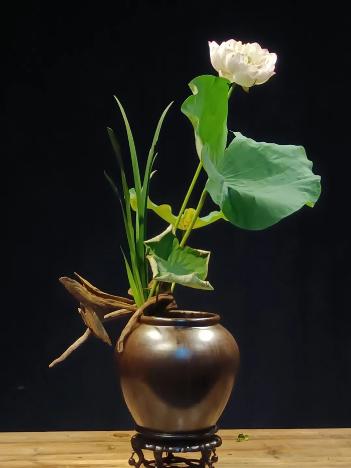 他不像很多其他老师一样,用盘或者缸插荷花,虽然这样更便于荷花吸水。他更喜欢用绘画的手法表现荷花,使用陶罐,造型简约,就像他特别喜欢的著名画家刘文顺的写意荷花,充满自然生趣。