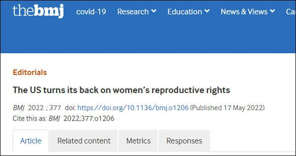自今年5月该文件被披露以来,多家顶级医学期刊发文谴责此事。《科学》(Science)、《自然》(Nature)等学术杂志发文指出法院无视科学证据是错误的。柳叶刀(The Lancet)更是直言“该法案的支持者手上将沾满妇女们的鲜血”。英国医学杂志文章(The BMJ)则痛批美国:在推进妇女生育权和健康权的趋势中,美国正迅速成为一个异类。