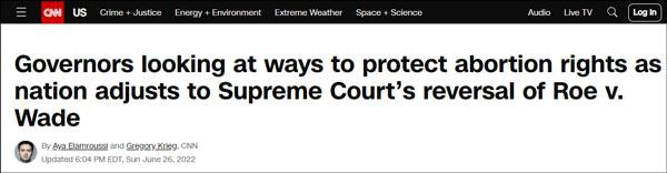 26日,美国有线电视新闻网(CNN)又发布一篇报道称,在国家适应最高法院推翻罗伊诉韦德案的过程中,各州长正在寻找保护堕胎权利的方法。