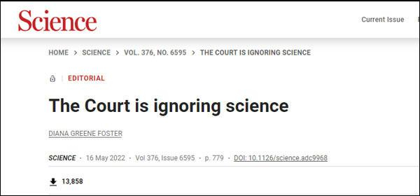 5月16日,《科学》杂志发表了一篇名为“法院正在无视科学”的文章,称有充分数据支持开放堕胎有助于维护患者的健康和幸福。