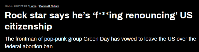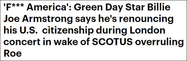 (观察者网讯)美国最高法院推翻“罗诉韦德案”历史性判决的当天(24日),美国著名朋克乐队“绿日”(Green Day)的主唱怒骂“去你的美利坚”,公开表示要“放弃美国国籍”。