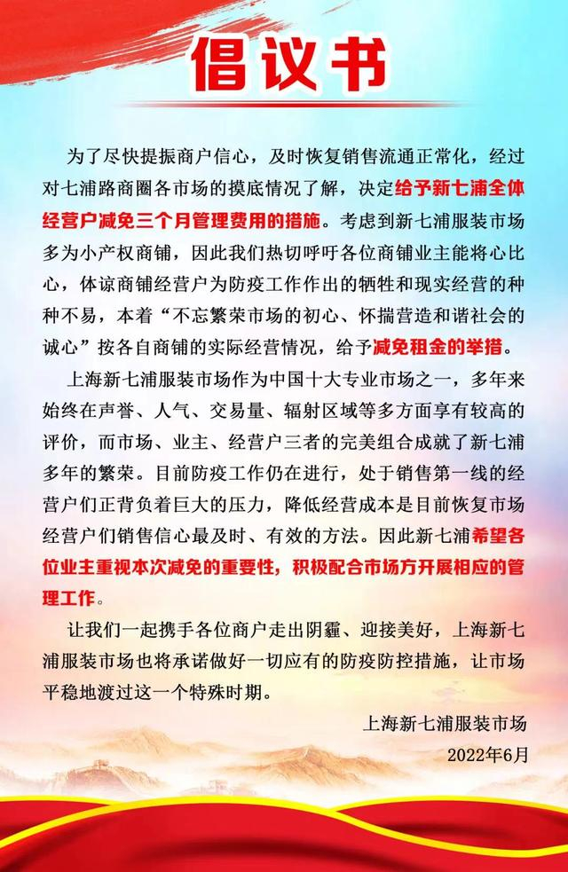 2022年6月,上海新七浦服装市场管理方发布倡议书,呼吁商铺业主按各自商铺的实际经营情况,给予减免租金的举措。 上海新七浦实业有限公司微信公众号 图