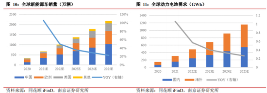 南京证券研究认为,在全球政策端和供给端共振下,新能源车有望保持长期较快增长。预计2025年全球新能源汽车销量有望达到2185万辆,2021年-2025年复合增速达到34.1%。同时,在新能源车高速发展推动下,预计2022年动力电池需求将达到577GWh,同比增长57.1%,到2025年将达到1157GWh,2021年-2025年复合增速达到38.99%。