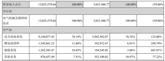 其中,动力电池系统销售系主要收入来源,2021年动力电池系统销售收入为 914.91亿元,同比增长 132.06%;锂电池材料销售收入 154.57亿元,同比增长 350.74%;储能系统销售收入为 136.23亿元,同比增长 601.01%。