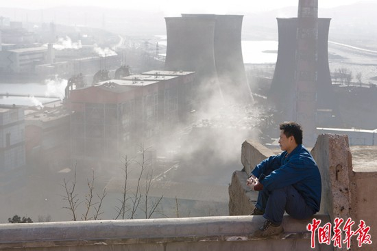 2010年12月17日,北京,一名青年工人在高处俯瞰首钢厂区。这里停产后,他也将面临重新就业的问题。 中青报·中青网记者 郑萍萍/摄