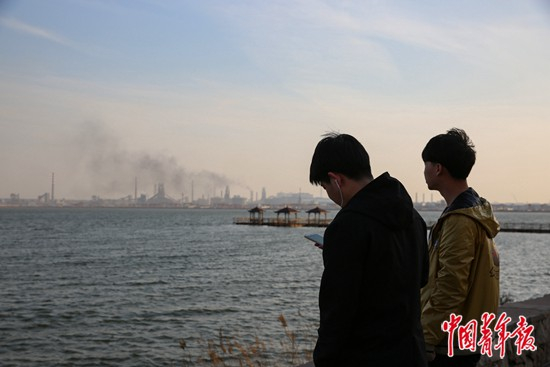 2019年4月10日,河北唐山曹妃甸工业区,首钢京唐公司园区内,几名在这里实习不到一个月的大专学生站在海边。他们即将从首钢工学院毕业,很可能将留在这里工作。 中青报·中青网记者 曲俊燕/摄