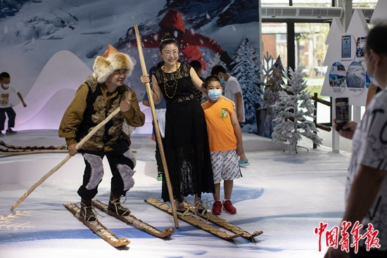 2021年9月5日,北京,2021年中国国际服务贸易交易会首钢园展区,在主打冰雪特色的阿勒泰展位上,观众与身穿民族服装的工作人员合影留念。 中青报·中青网记者 李隽辉/摄