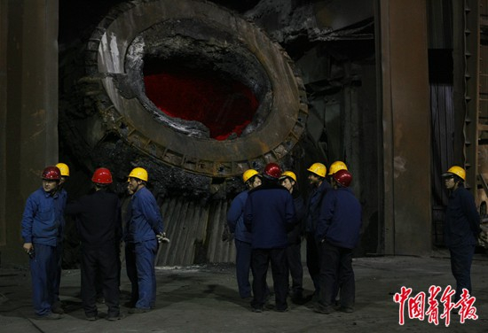 2010年12月19日,北京,首钢石景山厂区最后一座高炉停产,工人们在炉前等候合影留念。这一年年底,首钢北京石景山厂区钢铁主流程全面停产。 中青报·中青网记者 郑萍萍/摄