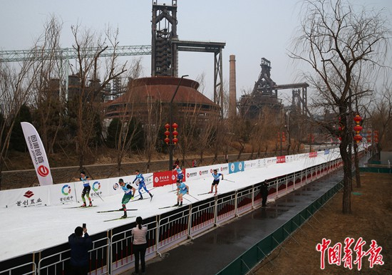 2019年3月2日,北京首钢园,2019国际雪联中国北京越野滑雪积分大奖赛首钢站,选手们在比赛中。 中青报·中青网记者 陈剑/摄