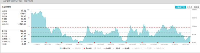 从估值角度来看,目前军工的PE当前值52.28,中位数63.85,危险值是72.17,分位点16.08%,相对位置低估的。