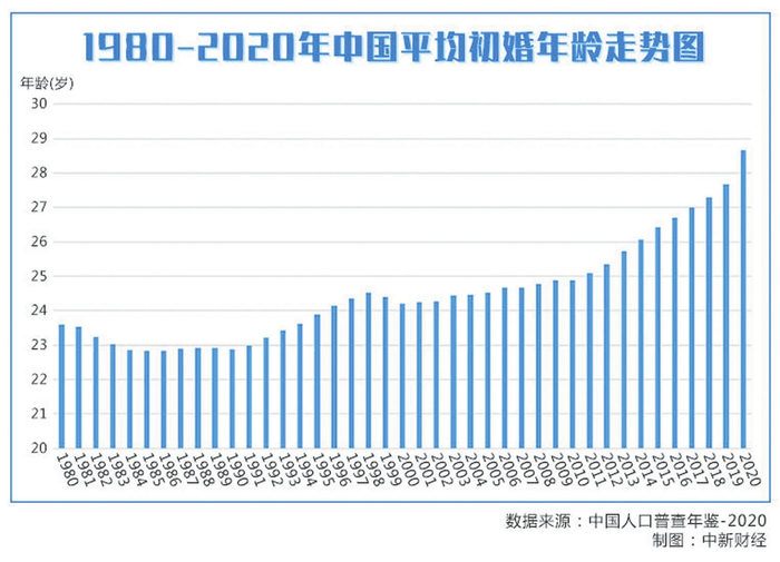 根据《中国人口普查年鉴-2020》,2020年,中国人平均初婚年龄涨到了28.67岁,其中,男性平均初婚年龄为29.38岁,女性为27.95岁。