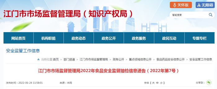 中国质量新闻网讯 6月24日,广东省江门市市场监管局网站发布2022年第7号食品安全监督抽检通告,涉及11批次酒类产品监督抽检合格信息。