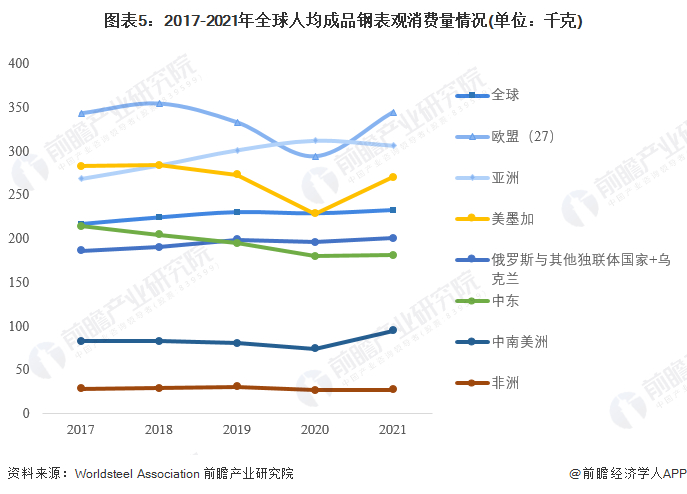 从人均钢铁表观消费量来看,2017-2021年全球人均钢铁表观消费量在230千克附近波动,2021年达到232.8千克。分区域来看,欧盟27国和亚洲人均钢铁表观消费量较高,2021年分别达到344.2千克和306.2千克;非洲人均钢铁表观消费量最低,2021年仅为27千克。从国家层面来看,韩国人均钢铁表观消费量居全球之首,2021年达到1075.6千克。