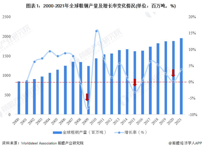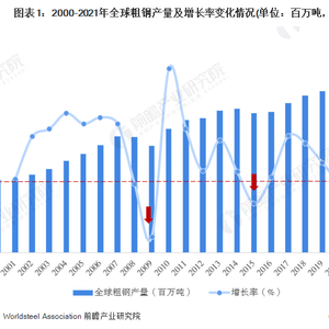 钢铁是工业上应用最广泛的金属材料,在国民经济中占有极其重要的地位。2000-2021年,全球粗钢产量波动攀升,从2000年的8.5亿吨增至2021年的19.51亿吨,产量实现翻倍增长,产量增速呈现波动放缓趋势,并且在一定程度上受经济周期影响,2008年、2009年及2015年出现负增长,2020年受疫情影响,增速显著下滑。