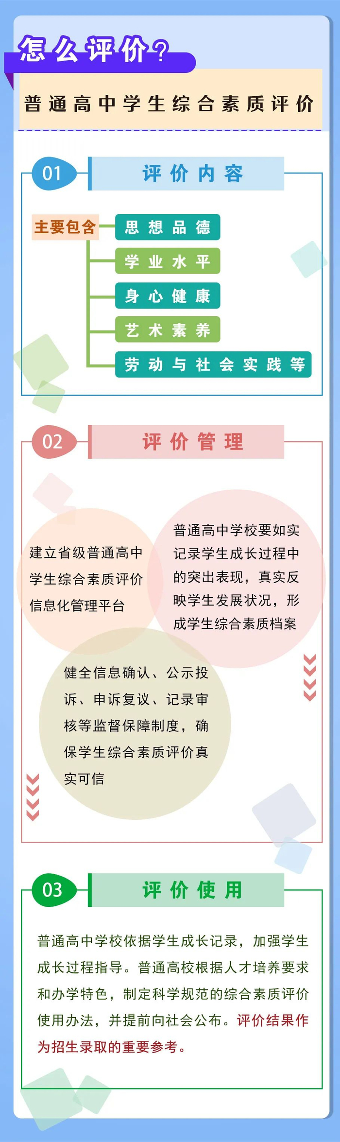 第二项任务是健全普通高中学生综合素质评价制度。普通高中学生综合素质评价是对学生全面发展状况的观察、记录、分析,是发现和培育学生良好个性的重要手段,是学生毕业和升学的重要参考。评价内容主要包含思想品德、学业水平、身心健康、艺术素养、劳动与社会实践等方面。普通高中学校要如实记录学生成长过程中的突出表现,真实反映学生发展状况,形成学生综合素质档案。普通高等学校根据人才培养要求和办学特色,制定科学规范的综合素质评价使用办法,并提前向社会公布。评价结果作为招生录取的重要参考。