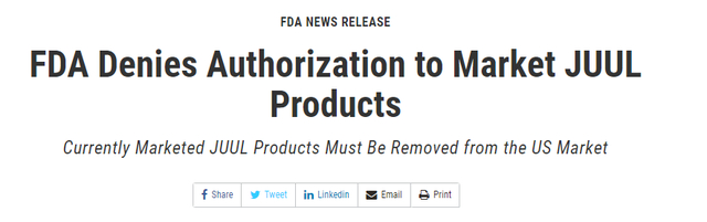 当地时间6月23日,美国食品药品监督管理局(FDA)向电子烟公司Juul Labs Inc.(下称:Juul)发布“营销拒绝令”,称由于Juul的电子烟产品没有通过烟草产品上市前申请(PMTA),该公司必须停止在美国销售和分销所有产品,否则将面临被行政处罚的风险。
