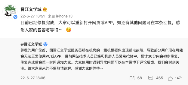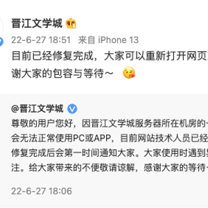 晋江文学城崩了?公司回应:服务器所在机房一组机柜疑似断电,已修复