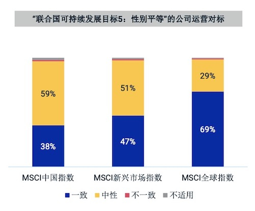 董越提及,投资者可以运用联合国“可持续发展目标”对标公司在性别平等上的表现。近40%的MSCI中国指数成分股的公司运营与“联合国可持续发展目标 5:性别平等”对标上相一致,会跟踪了解公司是否具有促进性别多样性的计划,衡量女性员工以及女性在高管和董事会成员中的比例,并确认是否存在相关的性别歧视和性骚扰争议。