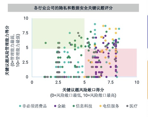 董越称,MSCI评级为各行业公司的隐私和数据安全关键议题进行了评分。大部分行业的表现比较分散,既有领先的公司(低风险敞口,高风险管理能力), 也有落后的公司(高风险敞口,低风险管理能力)。金融行业公司的表现比较集中在后者区间,可能对隐私和数据安全的风险应对不足。