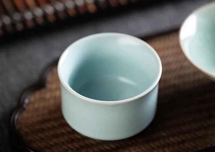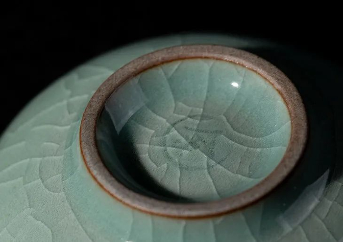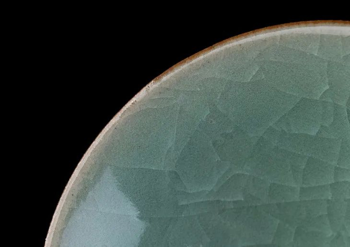 薄胎薄釉,釉面质感似玉,抚之如绢,有细微开片却不张扬,青色干净纯粹,温润而古朴。