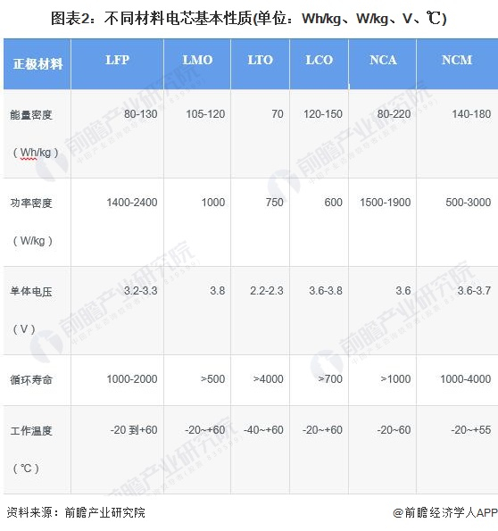 动力电池模组是指动力电池单体经由串并联方式组合并加保护线路板及外壳后,能够直接提供电能的组合体,是组成动力电池系统的次级结构之一。动力电池单体即电芯,按正极材料来分,主要包括钴酸锂、锰酸锂、磷酸铁锂以及镍钴锰酸锂三元材料等。不同材料电芯基本性质如下表所示: