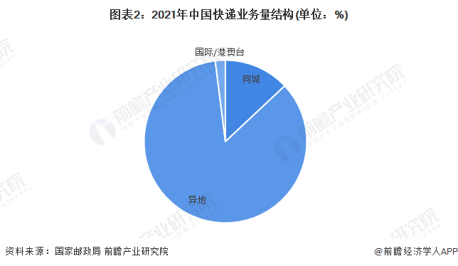2021年,同城、异地、国际/港澳台快递业务量分别占中国快递行业业务量的13.0%、85.0%和2.0%,异地快递市场份额最高。与2020年同期相比,同城快递业务量的比重下降1.6个百分点,异地快递业务量的比重上升1.8个百分点,国际/港澳台业务量的比重下降0.2个百分点。