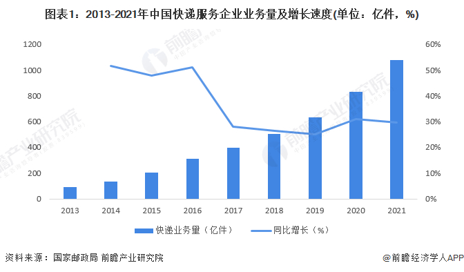 近年来,随着市场需求的快速提升以及快递行业的高速发展,快递业务量也在高速增长。2013-2021,我国快递业务总量迅速增长,保持在20%以上的增长速度。2021年,全国快递服务企业业务量累计完成1083.0亿件,较2020年增长29.9%。