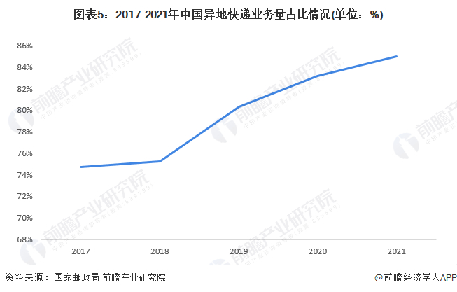 从异地快递业务量占比情况来看,2017-2021年中国异地快递业务量占中国快递行业业务量的比重呈逐年上升的发展趋势。2021年,中国异地快递业务量占比高达85.02%,较2017年上升了10.23个百分点。