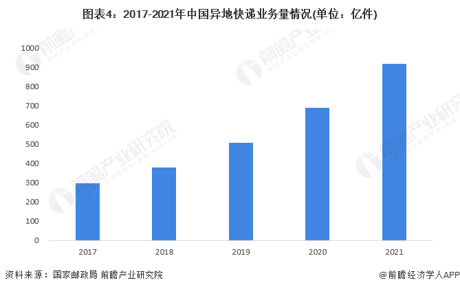 根据国家邮政局公布数据显示,2017-2021年,中国异地快递业务量呈逐年上升的发展趋势。2021年,中国异地快递业务量累计完成920.8亿件,同比增长32.8%,增幅高于行业增幅情况。