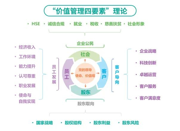 这个坐标体系的中央是出发点,包括党的领导、使命和价值观。第一个要素是企业公民,包含HSE(职业健康安全和环境),还有诚信合规、就业、税收、慈善扶贫、社会形象等,即社会责任。