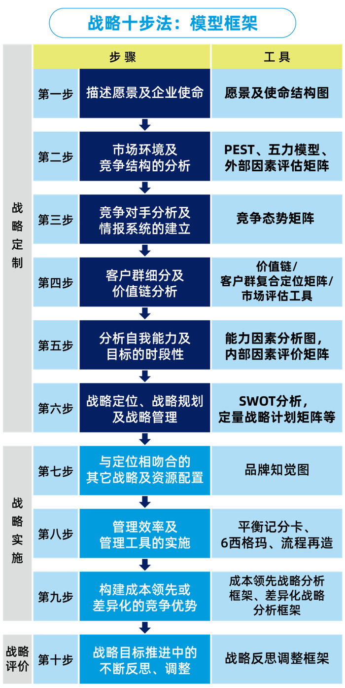 战略十步法讲的是怎么制定战略。理解它并从逻辑上弄通,就能逐步形成公司的战略定位。