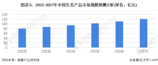 生发品牌近年来受到了越来越多的重视,防脱洗发液、生发液等产品的更新迭代明显加快,消费者对于防脱、治脱发以及生发等重视度逐步提高,前瞻预计中国生发品的市场份额将会在未来几年得到明显的提升,预计2027年中国生发产品市场规模将达到120亿元。