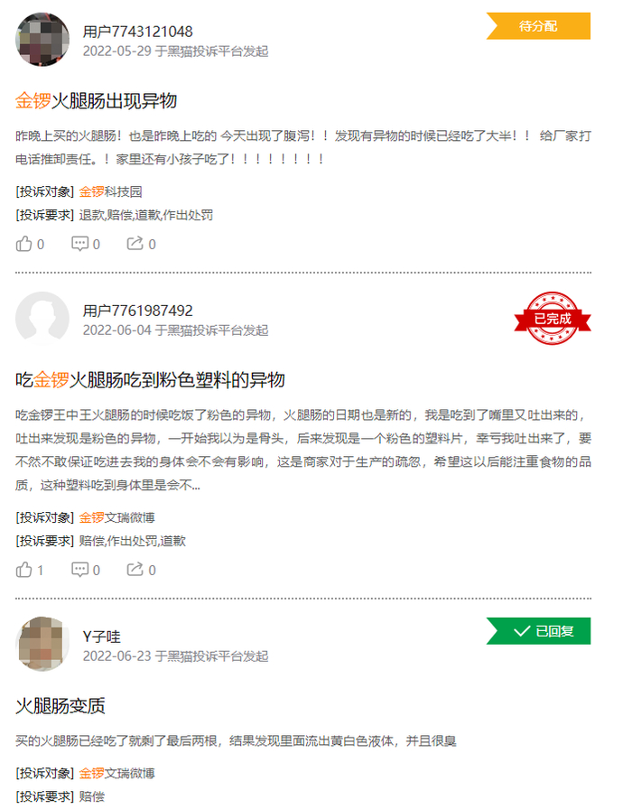 在第三方投诉平台上,也有不少关于金锣火腿肠吃出异物的投诉,有消费者称自己吃出“坚硬异物”,也有消费者称自己吃出“粉色塑料片”。