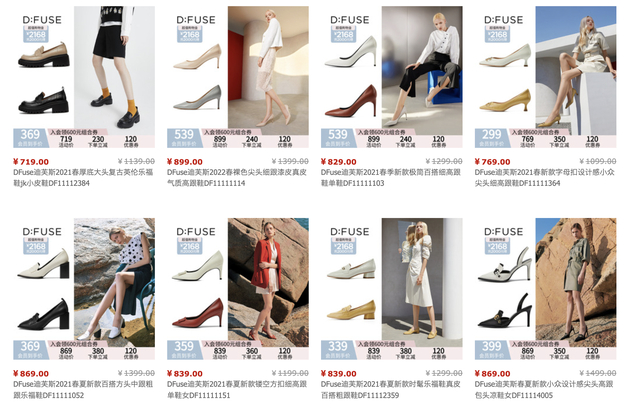 迪芙斯大部分产品的价位带都已降至500元以下,而星期六、索菲娅等原本就主打低价位的品牌其价格带已降至400元以下。此外,菲伯丽尔品牌微信商城和天猫旗舰店已然消失。该品牌或因竞争力不足而被收编至集合店SATURDAY MODE内,不再开辟单独的销售渠道。