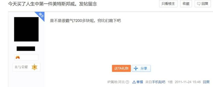 “我今天买了一件美特斯·邦威,你们这些穷*们穿得起吗?”