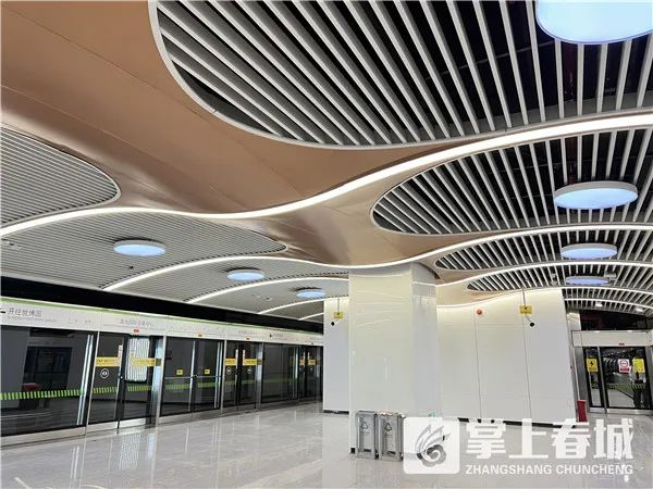 滇池国际会展中心站——结合会展中心的整体规划理念,整体空间通过弧形的起伏转折形成孔雀展翅的姿态,圆形的模拟天光照明的灯具也是孔雀尾羽的象征。整体空间简洁灵动,设计体现出国际化会展中心的现代简洁,时尚高端的气质,是展示昆明形象的一个重要窗口。