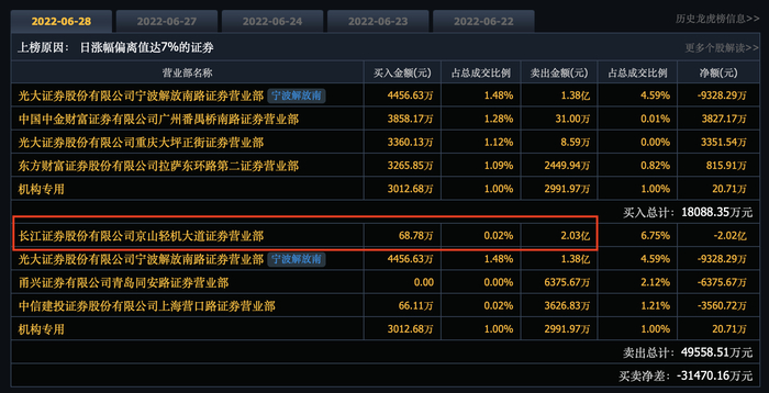值得注意的是,主卖中的卖一席位显示为长江证券京山轻机大道证券营业部,而该营业部距离京山轻机工业园仅3公里。这家“家门口”的营业部今日卖出金额2.03亿元,净卖出金额2.02亿元。