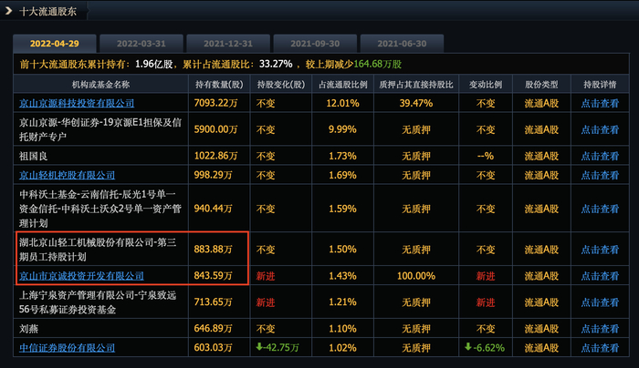 通过翻看京山轻机十大流通股东,截至4月29日,第六大流通股东第三期员工持股计划和第七大流通股东京山市京诚投资开发有限公司分别持有公司883.88万股和843.59万股,按今日24.02元的股票均价计算,股份金额分别为2.12亿元和2.03亿元,与上述营业部卖出金额较为接近。