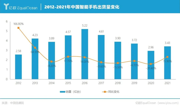 事实上,疫情并非中国智能手机行业寒冬的起点。根据中国信通院统计,国内智能手机出货量在2016年到达顶峰后,近年来一直都在持续滑坡。
