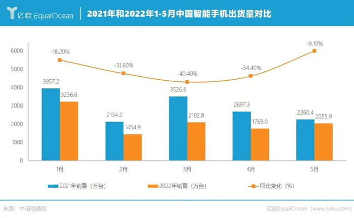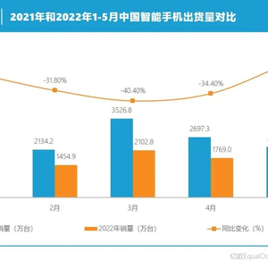 进入2022年,中国智能手机市场迎来至暗时刻。根据中国信通院统计,2022年1-5月,国内智能手机出货量累计达1.06亿台,同比降幅高达27%。其中,2月份的销量仅有1454.9万台,创造了两年来的最低记录。