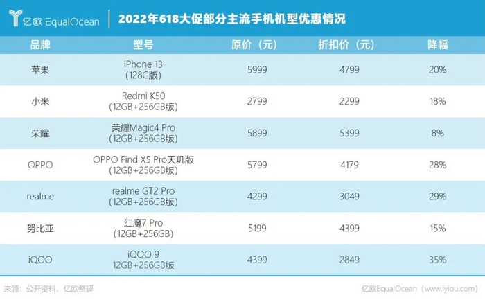 今年的618也被业界称为手机市场“最卷的一年”。最直观的表现就是连苹果都加入了价格大跳水,亿欧整理了部分主流品牌机型的618优惠情况,可以看到包括国内TOP5在内的手机厂商都将手机价格打到了“骨折”。