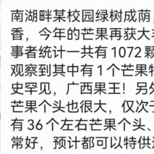 北青报记者注意到,随着高考成绩陆续放榜,广西南宁、钦州等地出现疑似利用芒果暗喻高考成绩的情况。网传截图显示,“南宁某中学果园在辛勤园丁培育下,今年盛产优质大果率高达近95%,其中超级大果(超过600克重)有近600颗,还有近30颗顶级果王。”另一所学校则显示,“南湖畔某校园绿树成荫、瓜果飘香,今年芒果再货大丰收,有好事者统计一共有1072颗芒果成熟,观察到其中1个芒果特别大,历史罕见,广西果王!另外还有两个芒果个头也很大,仅次于果王。”