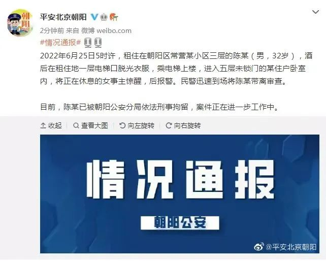 平安北京朝阳也发布了情况通报:“6月25日5时许,租住在朝阳区常营某小区三层的陈某(男,32岁),酒后在租住地一层电梯口脱光衣服,乘电梯上楼,进入五层未锁门的某住户卧室内,将正在休息的女事主惊醒,后报警。民警迅速到场将陈某带离审查。目前,陈某已被朝阳公安分局依法刑事拘留,案件正在进一步工作中。”