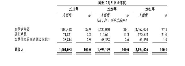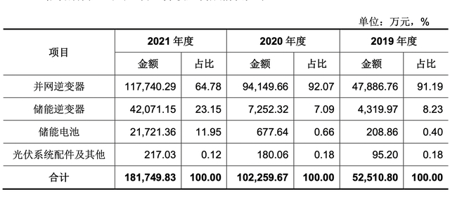 2019-2021年,古瑞瓦特的营收分别为10.01亿元、18.93亿元和31.94亿元。其中,光伏逆变器的收入分别为9亿元、16.3亿元和24.62亿元,占比分别约为89.9%、86.1%和77.1%。