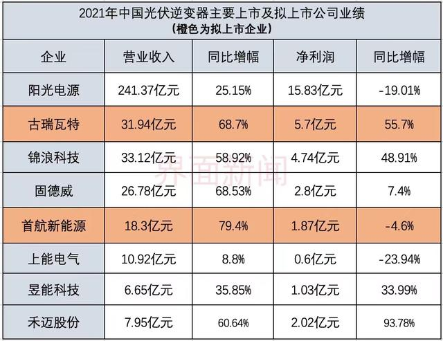 与已上市企业相比,古瑞瓦特去年业绩仅次于阳光电源,首航新能源则位于中等水平。